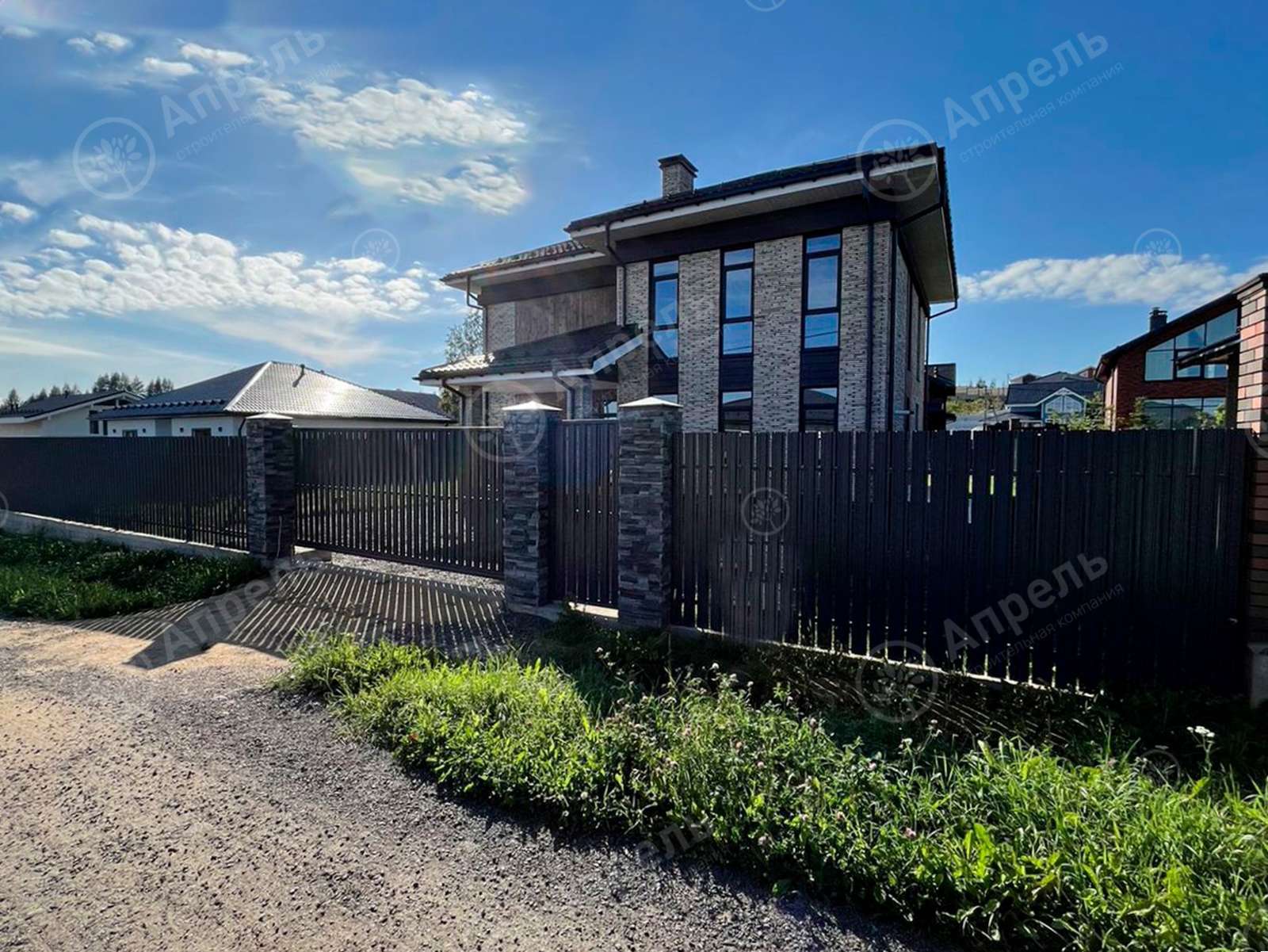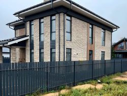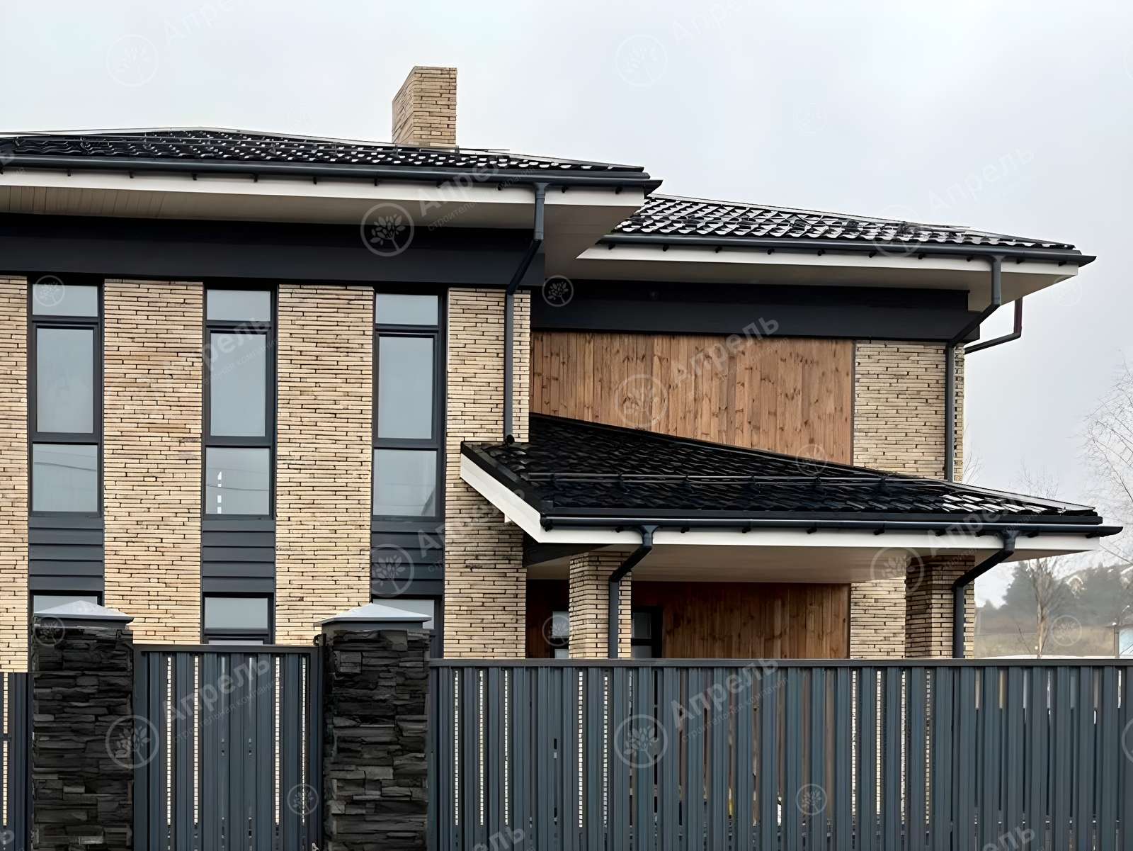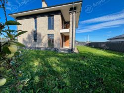 В этом доме 5 спальных комнат, кухня-гостиная и 3 санузла. Капитальные стены из газобетонного блока толщиной 400 мм. Фасад дома выполнен из ригельного кирпича в комбинации с декоративными фасадными панелями и планкеном. Большое крытое крыльцо и терраса дома на общем фундаменте с домом + балкон.